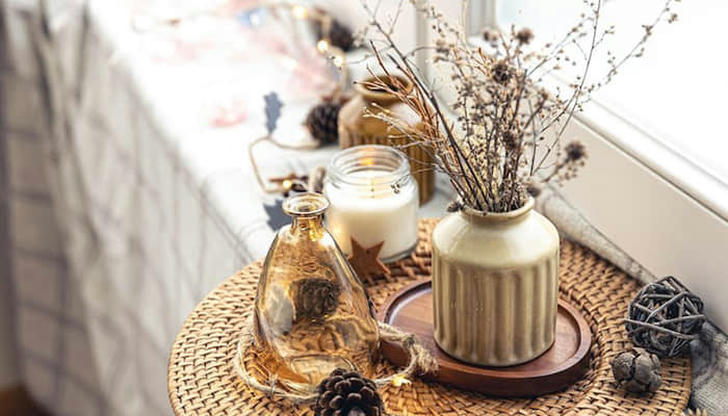 Add plants, dried flowers, pinecones, or branches in vases and bowls to create organic accents.